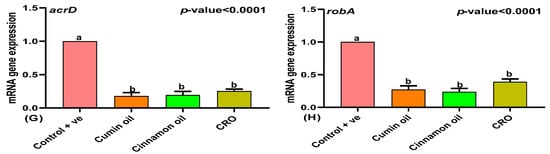 Treatment with sub-inhibitory concentrations (SICs) of cumin and cinnamon oils significantly downregulated the expression of efflux pump genes (acrB, mdtB, acrF, and acrD) in Salmonella compared to the untreated control group (p < 0.05; Figure 21). Although there was no significant difference in the expression of the regulatory genes soxS, marA, and robA between the cumin and cinnamon oil groups (p > 0.05), both oils effectively reduced their expression compared to both the control and ceftriaxone (CRO)-treated groups (p < 0.05; Figure 21B,C,G,H). Notably, cinnamon oil exhibited a more pronounced inhibitory effect on mdsB transcription compared to cumin oil (p < 0.05; Figure 21D). These results suggest that both cumin and cinnamon oils can effectively inhibit efflux pump activity in Salmonella by downregulating the expression of key efflux pump genes and their regulatory factors.