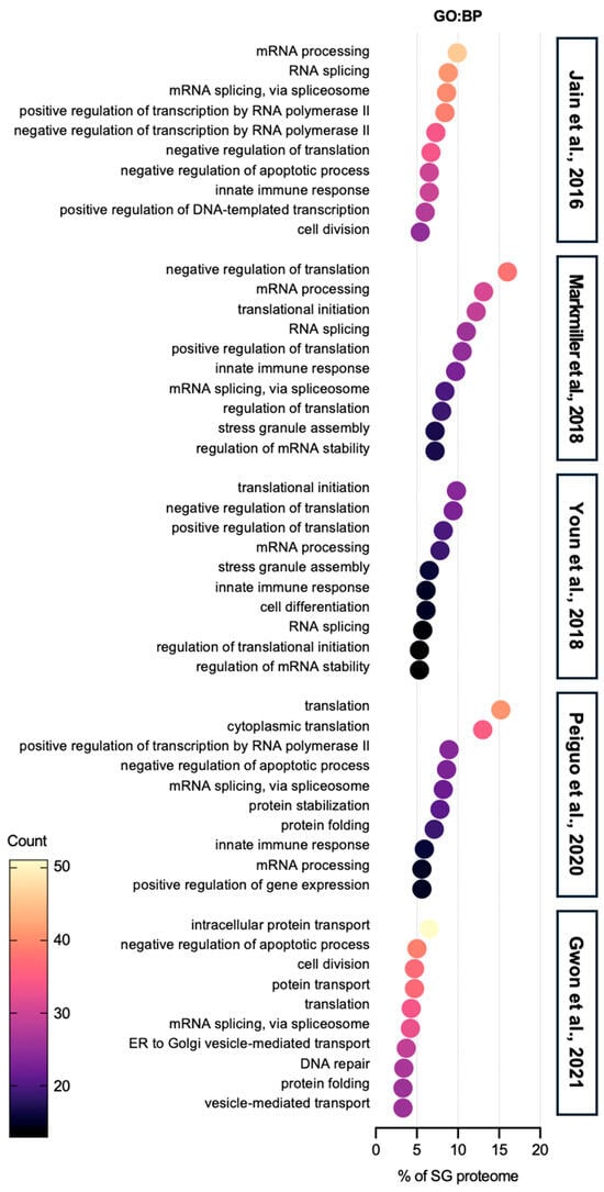 Gene ontology (GO) biological process (BP) analysis of the SG proteome reveals that SG components are predominantly involved in mRNA processing and translation (Figure 1). SGs are well-known for suppressing protein translation during stress and helping cells conserve energy and adapt. However, recent studies indicate that mRNAs within SGs can still undergo the full translation cycle—initiation, elongation, and termination []. This suggests that the high local concentration of translation machinery in a dense environment of SGs may promote translation under specific conditions, although further research is required to understand the underlying mechanisms, including how amino acids and tRNAs dynamically travel between SGs and the cytoplasm.
