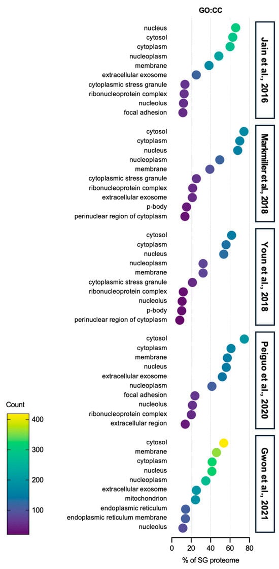 Gene ontology: cellular component analysis of SG proteome. The top 10 categories are shown from GO analysis on the cellular component (GO:CC) of proteins in SGs from five SG proteomes studies [,,,,]. Over 50% of SG proteins are related to the cytoplasm. Proteins associated with exosomes, which are secreted out of the cells, also account for more than 20% of SG proteins from five SG proteomes. Most interestingly, proteins from other organelles, such as P-body, endoplasmic reticulum, and mitochondria, are also sequestered into SGs, indicating that SGs can actively regulate the activity of specific organelles in stress conditions.