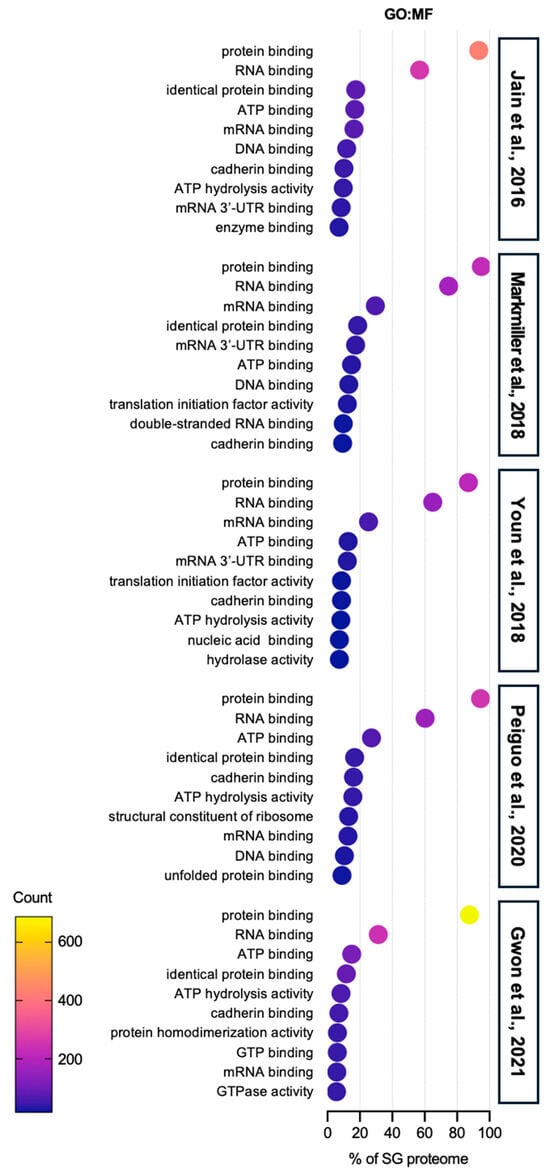 GO molecular function (MF) analysis reveals that protein- and RNA-binding-associated proteins are dominantly sequestered in SGs, but proteins involved in ATP hydrolysis, cadherin binding, and chaperone activities are also present (Figure 3). However, research on the roles of these proteins in SGs remains limited and needs further exploration.