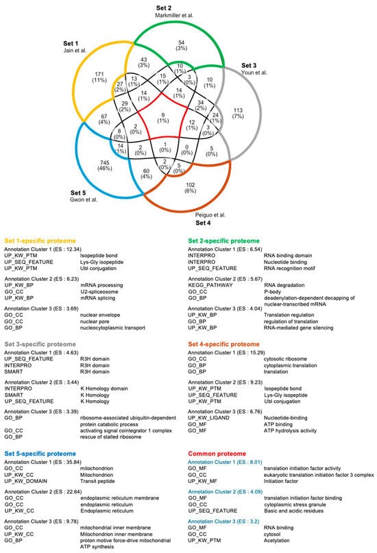 Comprehensively, among the five previously published stress granule (SG) proteome lists, only nine proteins were consistently identified across all datasets (Figure 4; DDX3X, EIF3B, EIF3E, EIF3F, EIF3L, EIF4A1, EIF4A1, EIF4G1, PABPC4, and PCBP1) [,,,,]. SG proteome list 1 contains many proteins involved in mRNA splicing and nuclear transport. On the other hand, list 2 features proteins performing classical SG functions, such as RNA sequestration. Similarly, list 3 is enriched with proteins clustered into the R3H nucleic acid-binding domain. List 4 contains well-known SG components involved in general SG formation and maintenance. Finally, list 5 shows enrichment for proteins associated with mitochondrial and ER functions, suggesting SGs may have broader roles beyond translational regulation. These findings underscore that SG composition is highly dynamic and influenced by various factors, including the stress environment, cell type, type of stress, and SG isolation methods. In the context of infection-induced SGs, factors such as the number and type of pathogens, infection duration, and immune cell type can significantly impact SG composition. Despite these complexities, no comprehensive omics studies have yet analyzed SGs formed during infections. Given that infections introduce more variables compared to typical stressors like oxidative stress or heat shock, future studies must carefully standardize experimental conditions. Establishing these parameters will be essential to accurately define and understand the role of SGs in pathogen infections.
