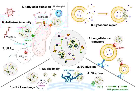 The dynamic interactions between SGs and organelles such as ER, mitochondria, and lysosomes, highlight their regulatory roles in cellular stress responses (Figure 5). The ER serves as a platform for SG assembly, facilitates their division through ER tubules, and exchanges mRNA with SGs to regulate translation and stress adaptation through ER stress regulation by clustering inositol-requiring enzyme 1 (IRE1α) [,]. SGs also modulate mitochondrial activity by redirecting fatty acids to lipid droplets, inhibiting β-oxidation []. More directly, in mitochondria, SGs interact with MAVS to enhance antiviral defense and influence the mitochondrial unfolded protein response (UPRmt) [,]. Additionally, SGs repair damaged lysosomal membranes and hitchhike on lysosomes for intracellular transport [,]. These findings emphasize that SGs are not isolated cellular components but highly dynamic components that communicate with other organelles. Because pathogen infection influences the activity and normal function of various organelles of host cells [,], the communication between SGs and organelles could fine tune the appropriate activity of specific organelles, and thus interactively cope with the infections. Understanding these interactions is important, particularly in the context of pathogen-induced SGs, as it may reveal novel insights into how cells cope with infections and maintain cellular homeostasis upon infection. Future studies should aim to understand SG–organelle communications to reveal their regulatory roles in cellular activity and disease mechanisms.