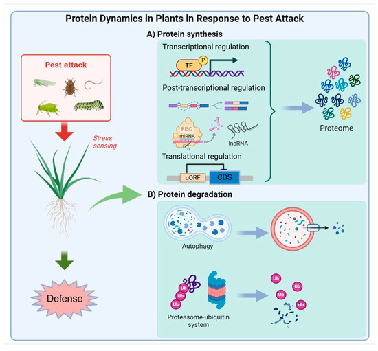 Protein dynamics in plants in response to pest attack. Upon pest invasion, transcriptional, post-transcriptional, and translational controls regulate the synthesis of immune-related proteins, ensuring their timely production during pest-induced stress (A). Concurrently, protein degradation pathways, including the ubiquitin–proteasome system (UPS) and autophagy, remove damaged or excess proteins, shaping plant defense mechanisms against pests (B).