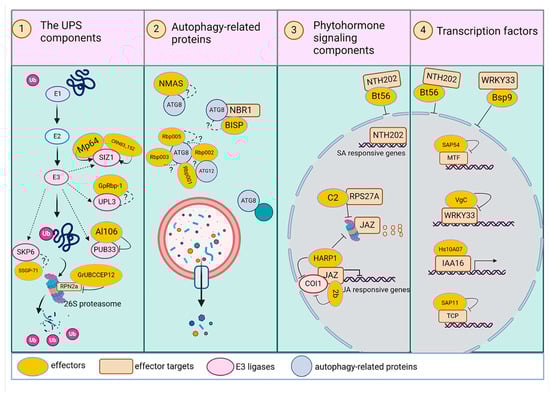 Pests have evolved to secrete effectors to manipulate and subvert host cell protein to their advantage [12]. By hijacking the essential cellular pathways, they create a conducive environment for their invasion and evade host immune responses. In contrast to pathogenic bacteria, fewer instances of plant proteins targeted by pests have been documented. In this review, we mainly focus on the primary components that insect and nematode effectors target to alter the host’s proteome (Figure 2). Readers are referred to several reviews for more detailed advances in insect and nematode effectors [79,80,81]. These components mainly belonged to the pathways discussed above: the UPS components in the UPS system; the autophagy-related proteins in the autophagy system; the phytohormone signaling components; and transcriptional factors in the downstream signaling pathways. These components are important factors that plants rely on to shape their proteome (Figure 2; Table 1). Through this mechanism, pests efficiently manipulate the composition of plant proteins and finally the plant immune responses.