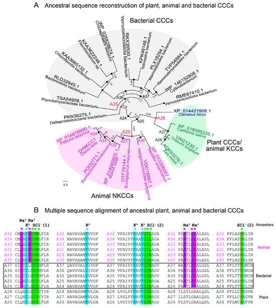 Ancestral sequence reconstruction with FireProtASR (https://loschmidt.chemi.muni.cz/fireprot, accessed on 25 October 2024) estimates the evolutionary history of CCCs across biological kingdoms. Scale = substitution per site. (A) Three clades of CCCs are indicated, where animal KCC and plant CCCs form one clade. (B) ProMals3D alignment of animal (magenta), bacterial (black; also framed), and plant (green) CCC ancestral sequences A24-A37. Descriptors above alignments indicate residues forming K+-(cyan), Na+-(magenta), and two Cl−-(green) binding sites (SCl (1) and SCl (2)).
