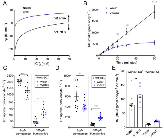 VvCCC-mediated 86Rb tracer fluxes display thermodynamic hallmarks of KCC cotransporters. (A) Predicted thermodynamic driving forces for KCC and NKCC cotransport into Xenopus oocytes as a function of [Cl−]i in the ND96 solution with 106.6 mM [Cl−]o, 96 mM [Na+]o, and 2 mM [K+]o. Driving forces were calculated assuming 100 mM [K+]i and 10 mM [Na+]i at 25 °C using the following equations: , and , where R is the gas constant (8.314 kJ·mol−1·K−1) and T is the absolute temperature. The dashed line represents FRP. (B) Time course of 86Rb uptake in oocytes injected with VvCCC or water in standard ND96 solution. Oocytes were pre-incubated in Cl−-free ND96 overnight before measurements (Cl− replaced with gluconate). Each data point is the mean ± standard deviation (SD, calculated in Microsoft Xcel 2019) of six oocytes (water) or eight oocytes (VvCCC). Asterisks represent significant differences at single time points (one-way ANOVA). (C,D) 86Rb uptake in oocytes injected with VvCCC or water after 1 h in ND96 with 10 mM KCl (C) or 5 mM RbCl (D) in the absence or presence of 100 µM bumetanide. Bars indicate mean ± standard error of the mean (SEM, calculated in Microsoft Xcel 2019). Asterisks represent significant differences between means (unpaired t-test). (E) 86Rb uptake in oocytes injected with VvCCC (blue) or water (black) after 20 min in ND96 without Na+ (left) or without Cl− (right). Bars indicate mean ± SEM. Asterisks represent significant differences between means (unpaired t-test). For all panels, asterisks denote * p < 0.05 ** p < 0.01 *** p = 0.001 **** p < 0.0001.