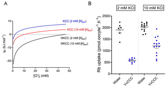 Although the atomic structures of the plant CCC proteins are unknown, the breakthroughs in animal CCCs suggested the potential residue identities underlying permeation in plant CCCs, using, e.g., comparative structural modeling and bioinformatics. Yet, the confirmation of the roles of essential residues for ion binding in plant CCCs remains unclear. This study focuses on the structural and transport properties of VvCCC from grapevine. At sequence and structural levels, VvCCC shows the hallmarks of KCC rather than NKCC proteins. The net 86Rb flux thermodynamics of VvCCC in Xenopus oocytes revealed the KCC-like transport properties and voltage-clamp electrophysiology explained Na+ conductance reported previously with VvCCC-expressing oocytes []. Our data indicate that VvCCC may function as a K+ and Cl− cotransporter in heterologous expression systems, which agrees with phylogenetic analyses [,]. Future work is required to determine the precise activity of CCC transport proteins in planta, and whether KCC-like symporter activity is a conserved feature of CCCs across the plant kingdom.
