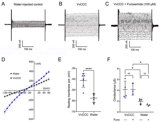 Upon 100 µM furosemide application, we observed that the conductance of VvCCC-injected oocytes changed only slightly (Figure 8F), as it is known that furosemide is not a high-affinity inhibitor of KCCs. It was reported that its Ki value was around 180 uM for KCC1 and lower (900 µM) for KCC4 with CCCs expressed in oocytes []. Furosemide did not affect the conductance of control oocytes, which was much lower than in the VvCCC-injected oocytes in its presence or absence (Figure 8F). No Cl− conductance was observed in this case, but the conductance mediated inward K+ currents under high external K+ (Supplementary Figure S4).