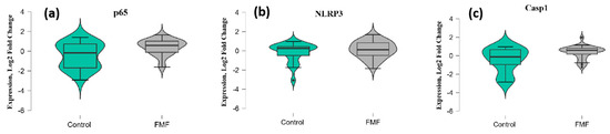 mRNA expression levels of p65 (a), NLRP3 (b), and Casp1 (c) in patients with FMF and healthy controls. The horizontal line that splits the box in two represents the median; the lower and upper sides of the box represent the 1st (Q1) and 3rd (Q3) quartiles; and whiskers represent the 1.5 interquartile range from Q1 and Q3.