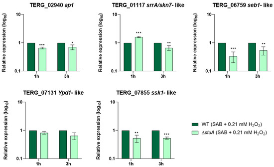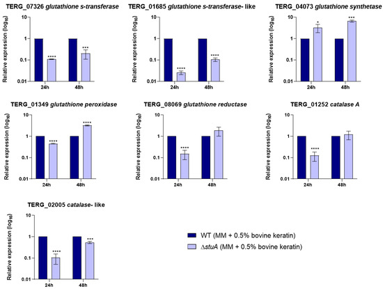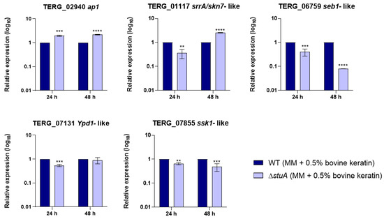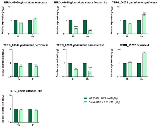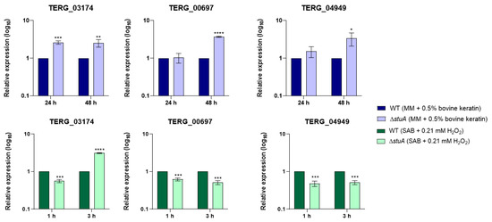 Our results reveal the upregulation of these genes in the ΔstuA mutant strain, particularly after 48 h of growth in the medium supplemented with keratin. When the mutant strain was exposed to hydrogen peroxide, the transcript levels of these genes decreased compared with those in the WT strain, except for TERG_03174, which remained upregulated after 3 h of exposure (Figure 8).