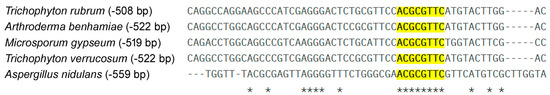 Consensus sequence position for StuA in the promoter region of the gene TERG_07326 of Trichophyton rubrum. Multiple sequence alignments of the upstream regions of the Glutathione S-transferase gene across different fungi (dermatophytes and Aspergillus nidulans). The consensus-binding sites were determined by identifying DNA sequences upstream (1000 bp) that matched the StuA 5′-[A/T]CGCG[T/A]N[A/C]-3′ DNA-binding consensus. Yellow boxes depict the StuA consensus sequence found in the genic promoters of these fungi. The distance between each consensus sequence and the start codon is shown in the parenthesis. The asterisks (*) indicate positions where all nucleotide sequences have identical bases, showing complete alignment in these specific positions.