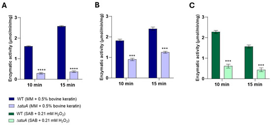 Intracellular catalase enzymatic activity in the ΔstuA mutant and WT strains. Catalase activity was measured in protein extracts from fungal growth in a minimal medium supplemented with keratin (minimal medium (MM) containing 0.5% bovine keratin) for 24 h (A) and 48 h (B) and from fungal exposure to hydrogen peroxide (Sabouraud medium (SB) with 0.21 mM hydrogen peroxide (H2O2)) for 3 h (C). The activity was assessed at 10 and 15 min intervals. The statistical significance was determined using an unpaired Student’s t-test with Holm–Sidak correction for multiple comparisons. *** p < 0.001 and **** p < 0.0001.