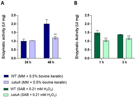 Intracellular glutathione S-transferase activity was measured in the ΔstuA mutant and WT strains. The activity was assessed in protein extracts from fungal cultivation in keratin (minimal medium (MM) containing 0.5% bovine keratin) at 24 and 48 h (A) and from fungal exposure to hydrogen peroxide (Sabouraud medium (SB) with 0.21 mM hydrogen peroxide (H2O2)) at 1 and 3 h (B). The enzyme activity was measured at 5 min intervals. The statistical significance was determined using an unpaired Student’s t-test with Holm–Sidak correction for multiple comparisons. ** p < 0.01.