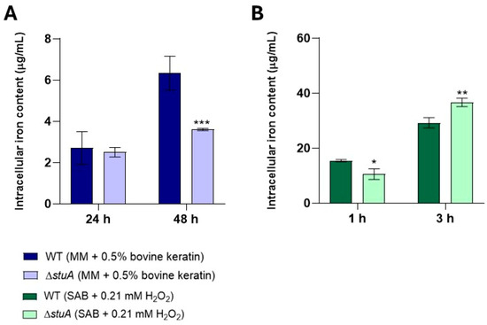 Intracellular iron levels in the ΔstuA mutant and WT strains. Intracellular iron levels were measured in protein extracts from fungal growth in a minimal medium supplemented with keratin (minimal medium (MM) containing 0.5% bovine keratin) for 24 and 48 h (A) and from fungal exposure to hydrogen peroxide (Sabouraud medium (SB) with 0.21 mM hydrogen peroxide (H2O2)) for 1 and 3 h (B). Statistical significance was determined using an unpaired Student’s t-test with Holm–Sidak correction for multiple comparisons. * p < 0.05, ** p < 0.01, and *** p < 0.001.