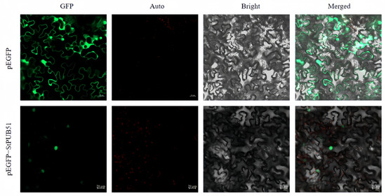 Subcellular localization observation showed that EGFP fluorescence signals were present in the nucleus, cytoplasm, and plasma membrane of the control group, while the GFP green fluorescence of the pEGFP-StPUB51 fusion protein in the nucleus of the experimental group was stronger, indicating that the StPUB51 protein was localized in the nucleus (Figure 2).