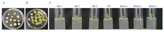 The microtuber chip was infected with Agrobacterium solution of overexpression vector pRI201-AN-StPUB51 and down-expression vector pCPB121-amiR-StPUB51. The microtuber chip was co-cultured for 2 days (Figure 3A) and transferred to differentiation medium to form callus and differentiated buds (Figure 3B). When the differentiated buds were cut and screened for roots (Figure 3C), plants that were able to take root normally within a week were initially considered transgenic strains. Electrophoretic results showed that the 676 bp fragment of NPT II was successfully amplified in both overexpressed and down-expressed lines (Figure 3D). qRT-PCR results showed that the expression levels of StPUB51 in transgenic plants OE-1, OE-2, and OE-3 were 2.09 times, 3.23 times, and 6.80 times those in WT, respectively, which were significantly higher than those in WT. The relative expression levels of RNAi-1, RNAi-2, and RNAi-3 were 0.30 times, 0.35 times, and 0.09 times that of WT, respectively, which were significantly lower than those of WT plants (Figure 3E). These results showed that overexpressed and down-expressed transgenic plants were successfully obtained.