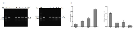 Acquisition and characterization of transgenic plants. (A) Potato chip co-culture; (B) healing group differentiation of shoots; (C) rooting screening of transgenic plants; (D) PCR assay of transgenic plants; (E) relative expression assay of transgenic plants. Note: Different small letters mean significant differences (p < 0.05, n = 3).