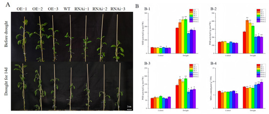 Physiological and biochemical indexes measured in transgenic plants under natural drought conditions. (A) Phenotypic changes of transgenic potato under drought stress for 14 d; scale bar = 2 cm; (B) (B-1) SOD activity; (B-2) POD activity; (B-3) CAT activity; (B-4) MDA activity. Note: Each column represents the mean ± SE (n = 3; * p < 0.05; ** p < 0.01).