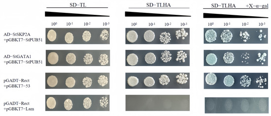 Nde I and BamH I were used as restriction endonucleases to construct pGADT7-StSKP2A and pGADT7-StGATA1 recombinant vectors by homologous recombination. The primer sequences are shown in Supplementary Table S3. pGADT7-StSKP2A and pGADT7-StGATA1 were co-transfected into yeast cells AH109, and co-transfected into SD-TL medium for 3–5 d at 30 °C. Then, 4 μL of spot samples were taken and diluted in 20 μL of 0.9% NaCl and SD-TL medium for 3–5 d at 30 °C. After this, colonies of about 2 mm were picked and put into 20 μL of 0.9% NaCl solution for dilution, aspirate. Further, 4 μL spot samples in SD-TLHA-X-α-gal were incubated at 30 °C for 4–5 d; blue spotted colonies were picked and put in 0.9% NaCl solution, and diluted in gradients of 100, 10−1, 10−2, and 10−3, respectively. Spot sample in SD-TL, SD-TLHA, and SD-TLHA-X-α-gal, respectively, were incubated at 30 °C for 5 d. The sample was then incubated for 4~5 d [63,64].