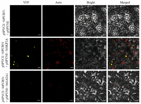 To verify the reliability of the Y2H result, the terminator-free StPUB51, StSKP2A, and StGATA1 were amplified by PCR. The primer sequences are shown in Supplementary Table S3, and pSPYCE-StPUB51, pSPYNE-StSKP2A, and pSPYNE-StGATA1 recombinant vectors were constructed by homologous recombination. pSPYCE-StPUB51, pSPYNE-StSKP2A, and pSPYNE-StGATA1 recombinant vectors were used, and the empty and recombinant plasmids were transformed into Agrobacterium tumefaciens GV3101, respectively. Primer sequences are shown in Supplemental Table S2. The bacterial fluids of pSPYCE-StPUB51 and pSPYNE-35S were mixed with pSPYNE-StSKP2A/StGATA1 in a 1:1 ratio and injected into tobacco leaves using pSPYCE-StPUB51 and pSPYNE-35S as a blank control. Injection and infiltration were performed concerning subcellular localization, and a yellow color was observed at the excitation wavelength of 514 nm by laser confocal scanning electron microscopy. Fluorescent protein expression site at 514 nm excitation wavelength [65].