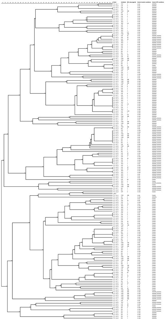 The UPGMA dendrogram obtained from ERIC-PCR profiles shows the restriction pattern similarity between E. faecalis JH2-2 and the obtained transconjugants. Abbreviations: TC—transconjugant. Control—control sample (transconjugant obtained from the strain before HPP treatment). 200 MPa—transconjugant obtained from the strain after exposure to 200 MPa pressure; 400 MPa—transconjugant obtained from the recovered strain after exposure to 400 MPa pressure.
