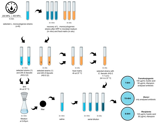 The experiment was performed using the membrane filter method [47]. Strains after HPP in microbial medium (200 MPa/5 min), and strains after recovery in microbial medium (after 400 MPa/5 min) were used as donors, and E. faecalis strain JH2-2 was used as the recipient. Donor strains not exposed to HPP treatment were gene transfer controls. Gene transfer was performed according to the scheme presented by Wiśniewski et al. (2024) [19] with some modifications (Figure 2). For strains, regeneration was performed after HPP treatment at 400 MPa/5 min. After the recovery of the cells, gene transfer proceeded according to the mentioned scheme. Three types of solid microbial media were used in this study—the first for transconjugants (T-BHI), containing 100 µg/mL fusidic acid, 50 µg/mL rifampicin and the appropriate concentration of the antibiotic encoding by the gene for which the transfection was performed; second—for donor (TD-BHI), containing only the proper concentration of the antibiotic for which resistance is encoded by the gene for which the transfer was carried out; third—for recipients (B-BHI), containing 100 µg/mL fusidic acid and 50 µg/mL rifampicin. To exclude the possibility of transformation DNase I (ThermoFisher Scientific, Waltham, MA, USA) was added to the plates (100 µg/mL). Transfer results were reported and defined as the transfer frequency, i.e., the number of transconjugant colonies (CFU/mL) divided by the number of donor cells.