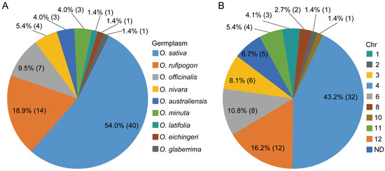 Distribution of BPH resistance genes/QTLs in rice chromosomes and germplasm resources. Numbers in parentheses represent the number of BPH resistance genes/QTLs in corresponding chromosomes (A) and germplasm resources (B).