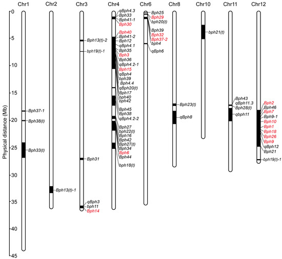 Chromosomal locations of BPH resistance genes/QTLs in rice. A total of 74 BPH resistance genes/QTLs have been identified in rice. Among them, except bph5, bph8, Bph22(t), Bph23(t) and bph24(t), 69 genes/QTLs have been mapped on 9 chromosomes. Numbers on the left indicate the physical distance. Black bars represent the genetic region of BPH resistance genes/QTLs. Red and black represent genes that have been cloned and genes that have not been cloned, respectively.