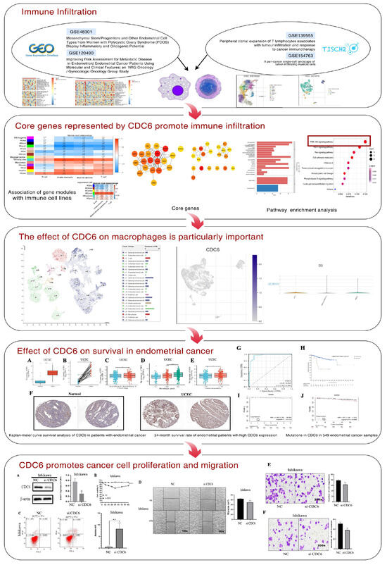 Despite the diverse inflammatory components in various cancer types [56], increasing evidence has demonstrated the importance of macrophages in the progression of solid cancers [57]. Macrophages are the key inflammatory effector cells, so better understanding their roles may uncover an effective therapeutic strategy for cancer [58]. In the inflammatory TME, the proportion of macrophages can be as high as 30–50%, and their function has been considered as the ‘soil’ for tumor growth. At the earliest stage of the tumor growth, macrophages polarize to the M1 type to generate an antitumor response. However, once tumors progress past the initial state, the macrophages polarize to M2 to promote tumor progression and malignancy [59,60,61]. M1 macrophages eliminate cancer cells by phagocytosis, antibody-dependent cytotoxicity, vascular damage, and tumor necrosis. M2 macrophages promote tumor growth and progression via enhancing cancer cell survival, angiogenesis, and immune suppression [62,63,64]. Furthermore, the study conducted by Jing et al. revealed that CDC6 primarily influences the infiltration and polarization of proliferating T cells and macrophages [65]. The research conducted by Luo et al. further demonstrates that CDC6 influences immune infiltration within lung adenocarcinoma tissues and exhibits a strong correlation with macrophages [66]. Our study found that the abundance of macrophage infiltration in carcinomatous PCOS and EC samples was abnormally increased. This indicates that macrophages may play an important role in the progression of carcinomatous PCOS to EC, and that the abnormal infiltration of macrophages might be driven by abnormal CDC6 expression.