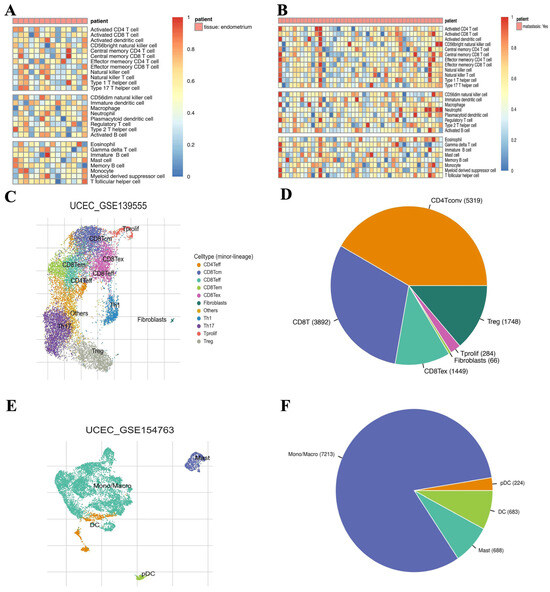 Abnormal invasion of immune cells promotes the occurrence of PCOS carcinogenesis. (A) Heatmap of immune cell subsets in PCOS samples with a tendency to become cancerous. (B) Heatmap of immune cell subsets in an endometrial cancer sample. The expression (C) and expression ratio (D) of each immune cell subset in the GSE139555 dataset, as analyzed based on the TISCH database. The expression (E) and expression ratio (F) of each immune cell in the GSE154763 dataset, as analyzed based on the TISCH database.