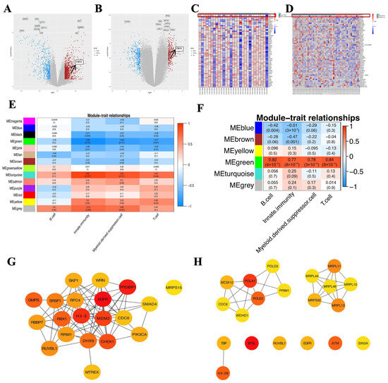 CDC6 promotes the formation of an immune tumor microenvironment. (A) Volcanogram of DEGs between normal and PCOS endometrial tissues. (B) Volcanogram of DEGs between EC breast and non-breast metastases. (C) Heatmap of the top 50 upregulated DEGs between normal and PCOS endometrial tissue. (D) Heat map of the top 50 upregulated DEGs between EC breast and non-breast metastases. (E) Heatmap of the correlation between module-characteristic genes and immune cells in a PCOS sample. The black, green, pink, sky blue, and yellow modules indicate high association with innate immunity and T cells. The rows represent module-characteristic genes (MEs) and their colors, whereas the columns represent immune cells. Red indicates a positive correlation between the module gene and immune cell. Blue indicates a negative correlation. The darker the color, the greater the relevance. The correlation coefficient and p-value are displayed in each cell. (F) Heatmap of the correlation between module-characteristic genes and immune cells in EC samples. The green, brown, and blue modules indicate high correlation with the innate immune system. (G) The top 20 genes with the degree value of the central module in the PCOS sample. (H) The top 20 genes in the degree value of the central module in the EC sample.
