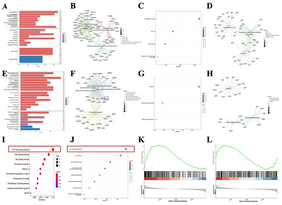 The analyses of the pathway enrichment of the genes with downregulated expression revealed that the PI3K-AKT pathway was meaningfully enriched in both PCOS and EC (Figure 4I,G). This suggests that the PI3K-AKT pathway may play a vital role in the carcinogenesis of PCOS to endometrial carcinoma. To further clarify the relationship between this pathway and DEG expression, we performed a GSEA. Although the PI3K-AKT pathway was not significantly enriched in the KEGG analysis of genes with upregulated expression, it showed a strong correlation with these genes. In addition, it showed a significant bidirectional enrichment tendency with respect to all genes (Figure 4K,L).