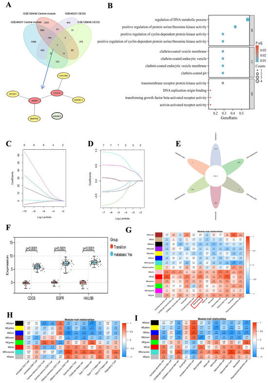 CDC6 causes the progression of PCOS to EC through abnormal macrophage invasion. (A) Venn diagram of the intersection of DEGs between normal and PCOS endometrial tissue, DEGs between EC breast and non-breast metastasis samples, central module genes in PCOS samples, and central module genes in EC samples. PPI network diagram of seven candidate genes, with CDC6/EGFR at the core. (B) GO and KEGG enrichment analyses of the seven genes. (C) Variable coefficient change characteristic plot of the PCOS sample with a carcinogenic tendency, minimum absolute contraction = 0. The value of the dataset as a biomarker was analyzed. (D) Variation characteristics of the variable coefficient of the EC samples, with minimum absolute contraction. (E) The genes in the PCOS sample dataset with a carcinogenic tendency after LASSO analysis, the Venn diagram of the genes after LASSO analysis, and the seven candidate genes in the EC sample dataset. The identification genes CDC6 and HAUS6 were obtained. (F) Expression and diagnostic values of CDC6, EGFR, and HAUS6 in PCOS samples with a tendency to become cancerous. (G) Heatmap of the correlation between innate immune subset module genes and immune cell invasion in the EC sample dataset. WGCNA of module–feature relationships between innate immune subsets and immune cell infiltration. The red and pink modules associated with the innate immune subset have the highest correlation coefficients and were identified as the core modules in the EC sample dataset. (H) Heatmap of the correlation between T cell subset module genes and immune cell infiltration in PCOS samples with a tendency to become cancerous. (I) Heatmap of the correlation between innate immune subset module genes and immune cell infiltration in PCOS samples with a carcinogenic tendency.