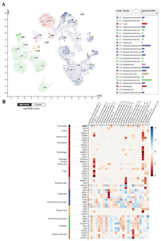 The infiltration of endometrial immune cells, as analyzed through single-cell sequencing in the HPA database. (A) Types and distribution of immune cells in the endometrium. (B) Heatmap of the correlation between CDC6 and immune cell marker genes in the endometrium.