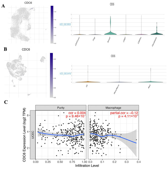 CDC6 is significantly expressed in macrophages of EC. (A) and (B) show CDC6 expression profiles in the single-cell GSE139555 and GSE154763 datasets; (C) CDC6 expression in patients with EC in the TIMER data was significantly correlated with macrophage immune infiltration.