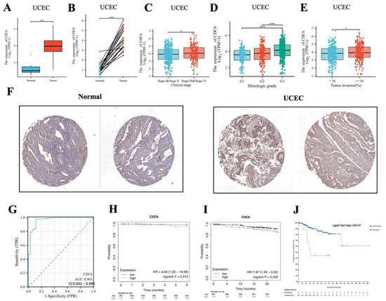 (A) mRNA expression levels of CDC6 in EC and normal tissues, as determined based on TCGA database. (B) mRNA expression levels of CDC6 in EC and paired adjacent tissues, as determined using TCGA database. The correlation between CDC6 expression and the pathological stages of UCEC (C), the histologic G grades in UCEC (D), and tumor invasion in UCEC (E). (F) The protein levels of CDC6 in normal and UCEC tissues, as determined based on the GEPIA database. (G) Receiver operating characteristic (ROC) curve for CDC6 expression in UCEC. (H,I) Kaplan–Meier survival curves showing that elevated CDC6 expression is associated with a worse survival (6 and 24 months) in UCEC. (J) The overall survival time related to CDC6 mutation was statistically poorer.(* p < 0.05, *** p < 0.001).