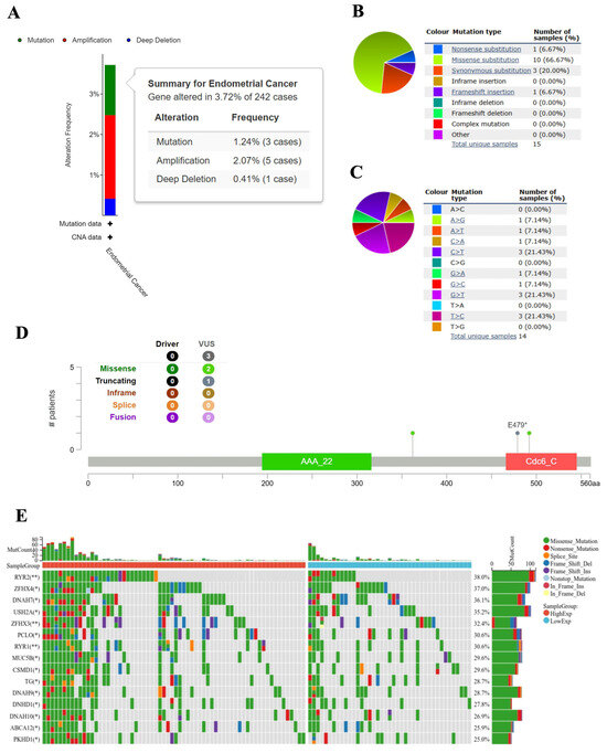 The cBioPortal database revealed that 3.72% (9/242) of the patients with UCEC had variations in CDC6: mutations in 1.24%, amplifications in 2.07%, and deep deletions in 0.41% (Figure 9A). Therefore, the COSMIC database was used to further evaluate the mutation types. Missense substitutions, nonsense substitutions, synonymous substitutions, and frameshift insertions occurred in 66.67%, 6.67%, 20%, and 6.67% of the UCEC samples, respectively. Furthermore, the base substitutions were mainly A>G (7.14%), A>T (7.14%), C>A (7.14%), C>T (21.43%), G>A (7.14%), G>C (7.14%), G>T (21.43%), and T>C (21.43%) (Figure 9B,C). The types, sites, number of CDC6 cases, and the genetic alterations are shown in Figure 9D. A missense mutation in CDC6 was the main type of genetic alteration. We further found an E479* alteration in the CDC6_C domain, which was detected in one case of CDC6. Finally, CDC6 truncation was observed (Figure 9D).