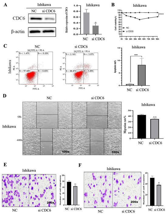 We evaluated the role of CDC6 in the proliferation, migration, invasion, and apoptosis of EC cells. First, we successfully transfected Ishikawa cells with CDC6 siRNA. The Western blotting results showed that the protein expression level in the siCDC6 group was significantly lower than that in the NC group (Figure 10A). Furthermore, the CCK-8 assay was used to evaluate the effect of CDC6 on EC cell proliferation. The silencing of CDC6 inhibited the proliferation of Ishikawa cells (Figure 10B). Moreover, the flow cytometric analyses revealed that the rate of apoptosis in the siCDC6 group was significantly higher than that in the NC group (Figure 10C). We performed wound healing and Transwell assays to further determine whether CDC6 affects the migration and invasion of EC cells (Figure 10D). The migration and invasion of the siCDC6 group were significantly lower in the NC group than in the control group (Figure 10E,F). These results suggest that CDC6 promotes the migration and invasion of endometrial carcinoma cells but inhibits apoptosis.