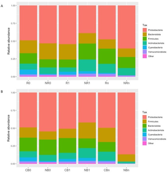However, there were statistically significant differences in the relative abundance of particular phyla between R vs. NR and CB vs. NB subgroups. At T1, there was a higher relative abundance of Proteobacteria phylum (54% vs. 39%) and a lower relative abundance of Firmicutes and Actinobacteriota phyla (11% vs. 22% and 6% vs. 17%, respectively) in the circulating cfmDNA of R compared to NR (p-value ≤ 0.05, R1 vs. NR1, Figure 2A–C). Moreover, the relative abundance of Firmicutes phylum in the circulating cfmDNA increased during treatment regardless of clinical outcome. In detail, in NR, it increased at T1, being significantly higher than at T0 (p-value ≤ 0.05, NR0 vs. NR1, 12% vs. 22%, Figure 2B), while in R and CB, it increased at Tn, being significantly higher than at T1 (p-value ≤ 0.05, R1 vs. Rn and CB1 vs. CBn, 11% vs. 21% and 13% vs. 20%, respectively, Figure 2B,D). Other statistically significant differences in the relative abundance of particular phyla in the circulating cfmDNA between study subgroups have not been described here as they referred to noncorresponding subgroups, i.e., subgroups with different clinical outcomes to the anti-PD-1 therapy at different collection time points.