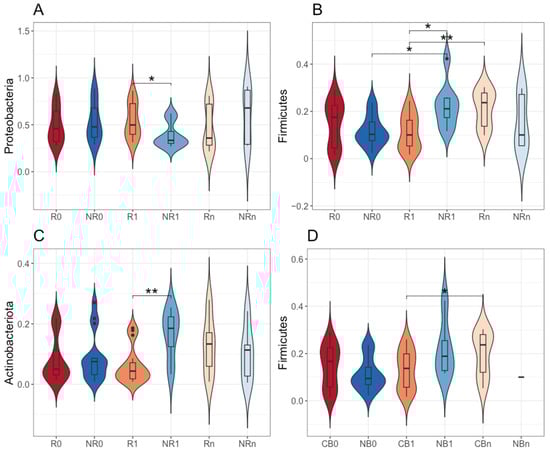 The comparison of the relative abundance of phyla: (A) Proteobacteria, (B,D) Firmicutes, and (C) Actinobacteriota in the circulating cell-free microbial DNA (cfmDNA) between advanced melanoma patients receiving the anti-PD-1 therapy, (A–C) classified as responders (R) and non-responders (NR) or (D) as patients with clinical benefit (CB) and patients with no clinical benefit (NB) according to the clinical outcome to the ICI therapy, before the anti-PD-1 therapy commencement at T0 (0) and during therapy at T1 and Tn (1 and n, respectively). The p-values describing the statistical significance of the differences in the relative abundance of particular phyla between study subgroups were calculated with the t-test. The p-values ≤ 0.05 were regarded as significant (*: p-values ≤ 0.05, **: p-values ≤ 0.01). The analysis indicated a higher relative abundance of Proteobacteria phylum and a lower relative abundance of Firmicutes and Actinobacteriota phyla in the circulating cfmDNA of R as compared to NR at T1 and an increase in the relative abundance of Firmicutes phylum during treatment regardless of clinical outcome.