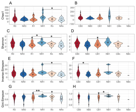 The alpha diversity of circulating cell-free microbial DNA (cfmDNA) was measured using: (A,B) Chao1, (C,D) Shannon, (E,F) inverse Simpson, and (G,H) Gini–Simpson indices. Comparison between advanced melanoma patients receiving the anti-PD-1 therapy (A,C,E,G) classified as responders (R) and non-responders (NR) or (B,D,F,H) as patients with clinical benefit (CB) and patients with no clinical benefit (NB) according to the clinical outcome to the ICI therapy, before the anti-PD-1 therapy commencement at T0 (0) and during therapy at T1 and Tn (1 and n, respectively). The p-values describing the statistical significance of differences in the circulating cfmDNA alpha diversity between study subgroups were calculated with the t-test. The p-values ≤ 0.05 were regarded as significant (*: p-values ≤ 0.05, **: p-values ≤ 0.01). The analysis indicated increased bacterial ASV alpha diversity in patients with unfavorable clinical outcomes at T1.