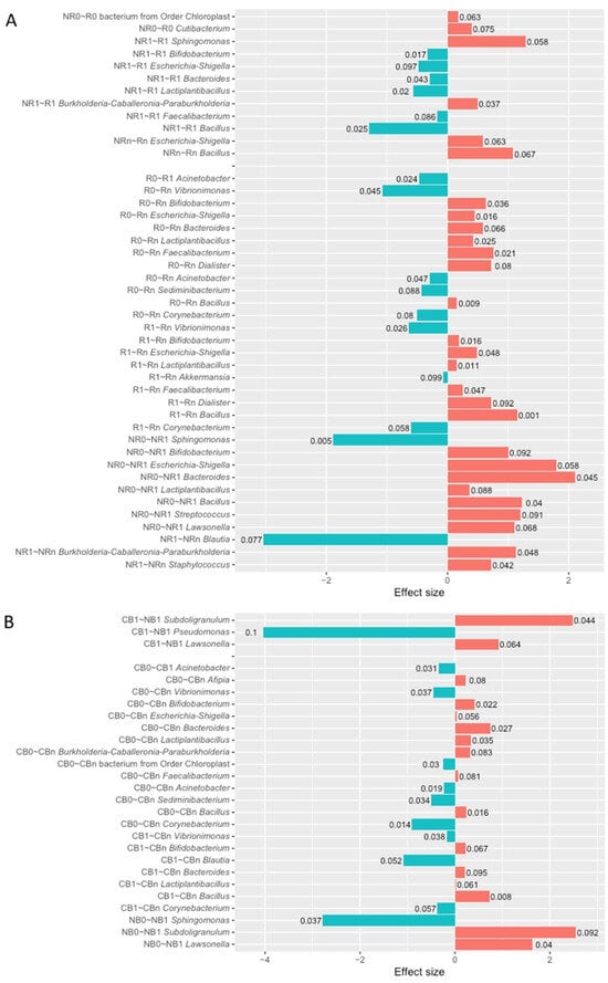 The differential abundance analysis (DAA) was performed using ANOVA-like Differential Expression version 2 (ALDEx2) tool. The differentially abundant taxa in the circulating cell-free microbial DNA (cfmDNA) were identified at the genus level in the comparisons between subgroups of advanced melanoma patients classified as (A) responders (R) and non-responders (NR) or (B) as patients with clinical benefit (CB) and patients with no clinical benefit (NB) according to the clinical outcome to the ICI therapy, before the anti-PD-1 therapy commencement at T0 (0) and during therapy at T1 and Tn (1 and n, respectively). Moreover, the differentially abundant taxa in comparisons between particular collection time points (T0 vs. T1, T0 vs. Tn, and T1 vs. Tn) within those subgroups were also indicated with the DAA. The p-values describing the statistical significance of the DAA results were placed at the tips of the bars. The figure illustrates only the statistically significant results (the Wilcoxon rank test, p-values < 0.1). The direction of changes in the relative abundance of taxa between the two subgroups being compared was assessed based on the effect size value. The first group of the two being compared is considered a reference group, whereas the second one is a tested group (group designations are placed on the left side of the graph at the beginning of the following lines; ‘reference group~tested group’). A positive effect size (red bars) suggests an increase in the relative abundance of a particular taxon in the tested group compared to the reference group, while negative (blue bars)—decrease. Effect size also measures the biological significance of the observed differences (the larger the effect size, the more substantial the difference between subgroups). The names of the differentially abundant taxa are placed on the left side of the graph (next to the subgroup designation). The analysis indicated that circulating cfmDNA signatures were associated with clinical outcomes and have changed during the anti-PD-1 therapy.