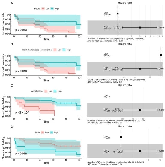 Examples of the most significant associations between the relative abundances of selected taxa in baseline circulating cfmDNA and survival outcomes expressed as progression-free survival—PFS (A,B) and overall survival—OS (C,D). PFS and OS rates were plotted with the Kaplan–Meier survival curves (on the left side of the graph), which were compared using the Log-rank (Mantel–Cox) test. The associations between the relative abundance of taxa and survival outcomes were examined with the Cox regression. The p-values < 0.1 were regarded as significant. The maximally selected rank statistics were used to determine the relative abundance of microbial taxa (low vs. high). A Cox proportional hazard model was visualized with a forest plot (on the right side of the graph). It shows hazard ratio (HR); HR > 1 indicates an increased risk of disease progression and death, while HR < 1 indicates a decreased risk. The analysis indicated that a high relative abundance of the Acinetobacter genus and Xanthobacteraceae genus member in the baseline circulating cfmDNA prognosticated improved survival outcomes, while enrichment in the genera Blautia and Afipia prognosticated poor survival outcomes.