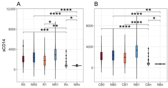 Collectively, there were statistically significant differences in the sCD14 level between patients with distinct clinical outcomes (Figure 6). At T1, it was higher in NR than R, while at Tn, there was an opposite trend (also in CB vs. NB at Tn). These findings correspond with the changes in the circulating cfmDNA in those subgroups (Figure 4), implying that microbial translocation to the circulatory system could induce sCD14 release. However, non-microbial ligands might also contribute to this response (at T0 and T1) as the biomarker concentration decreased at Tn in both subgroups regardless of clinical outcome (Figure 6).