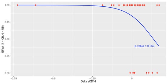 A logistic regression analysis indicated that an increase in the concentration of plasma sCD14 at T1 (as compared to its level at T0) was associated with a decreased probability of receiving clinical benefit from the anti-PD-1 therapy (p-value = 0.053, Figure 7).