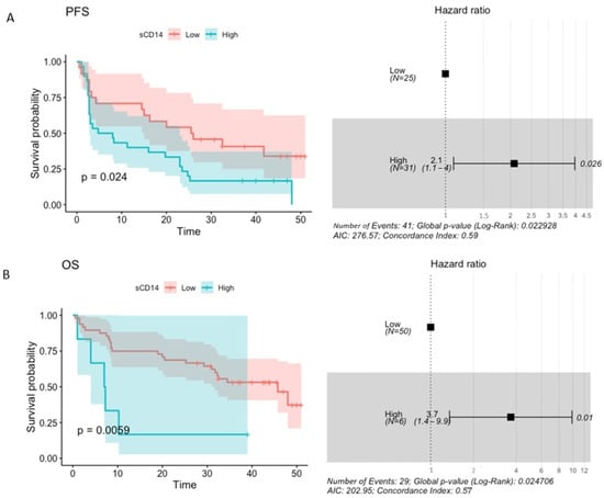 The association between the baseline plasma sCD14 concentration and survival outcomes expressed as progression-free survival—PFS (A) and overall survival—OS (B). PFS and OS rates were plotted with the Kaplan–Meier survival curves (on the left side of the graph), which were compared using the Log-rank (Mantel–Cox) test. The associations between baseline concentration of plasma sCD14 and survival outcomes were examined with the Cox regression. The p-values < 0.1 were regarded as significant. The maximally selected rank statistics were used to determine the plasma sCD14 level (low vs. high). A Cox proportional hazard model was visualized with a forest plot (on the right side of the graph). It shows hazard ratio (HR); HR > 1 indicates an increased risk of disease progression and death, while HR < 1 indicates a decreased risk. This analysis indicated that high baseline sCD14 level prognosticated worse survival outcomes.