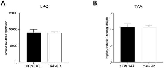 Oxidative damage to proteins was evaluated by measuring the lipid oxidative damage (LPO) and total antioxidant activity (TAA) in mouse brain lysates. No significant differences were found between control animals and CAP-NR-treated animals (Figure 1A,B).