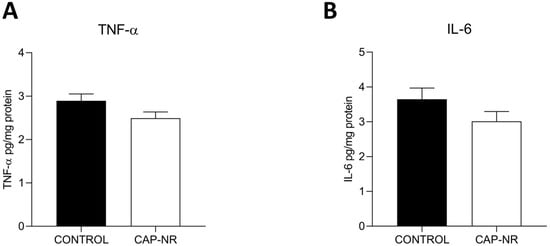 Inflammatory markers in the brain of control and CAP-NR-treated mice. The expression of cytokines is measured as pg IL/mg total protein: (A) TNF-α, (B) IL-6. Data are represented as mean and standard error of the mean (SEM).