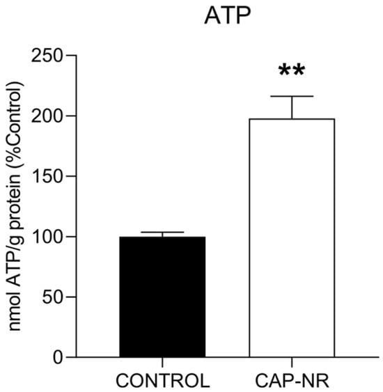 ATP levels in the brain of control and CAP-NR-treated mice. ATP levels are expressed as nmol ATP/g total protein. ** p ≤ 0.01. Data are represented as mean and standard error of the mean (SEM).