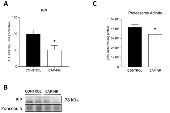 Endoplasmic reticulum (ER) stress and proteasomal activity in the brain of control and CAP-NR-treated mice. Representative immunoblots and quantification of (A) BiP; (B) quantification; (C) proteasome activity ratio (expressed as pmol AMCx min/mg of protein). * p ≤ 0.05. Data are represented as mean and standard error of the mean (SEM).